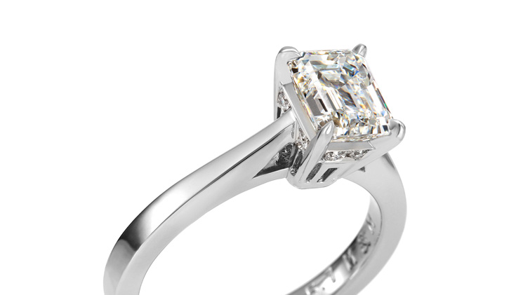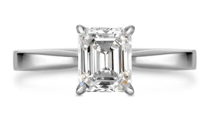 優雅でシャープな印象をもつエメラルドカット。エメラルドカットのダイヤモンドはインクルージョン(内包物)の少ない高品質な原石からカットされ、透明感のある輝きが魅力です。